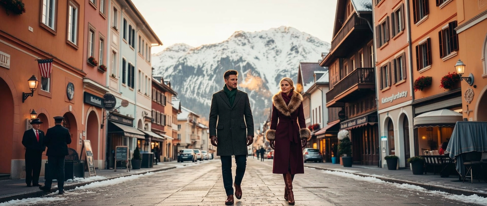 A slow turn along the Vorderstadt at the late hour — colorful pastel medieval Tyrolean facades on both sides, narrow cobblestone street, warm lamplight on the walls, snow on the rooftops. The town's most quietly atmospheric passage.