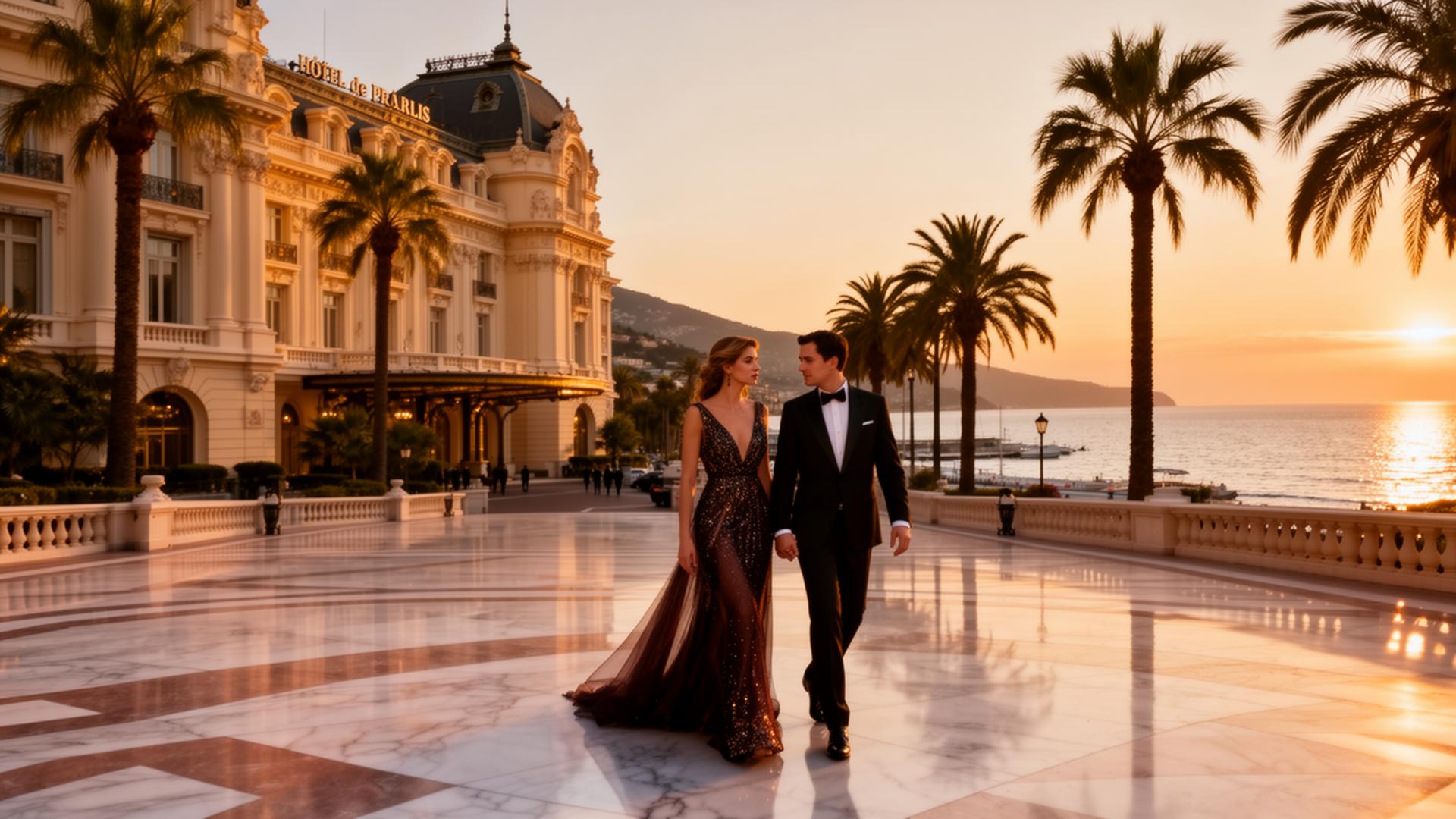 A slow turn around the Place du Casino at the late hour — the Belle Époque facade of the Casino, manicured gardens, polished marble underfoot, palm trees, vintage cars. The principality's most quietly considered passage between the morning and the evening.