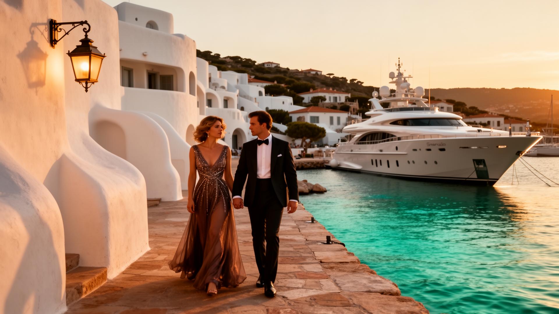 A slow turn along the old port at the late hour — the masts catching the gold, the yachts at the quay, the Costa quietly arranging itself before the evening begins. The most cinematic walk on the Costa.