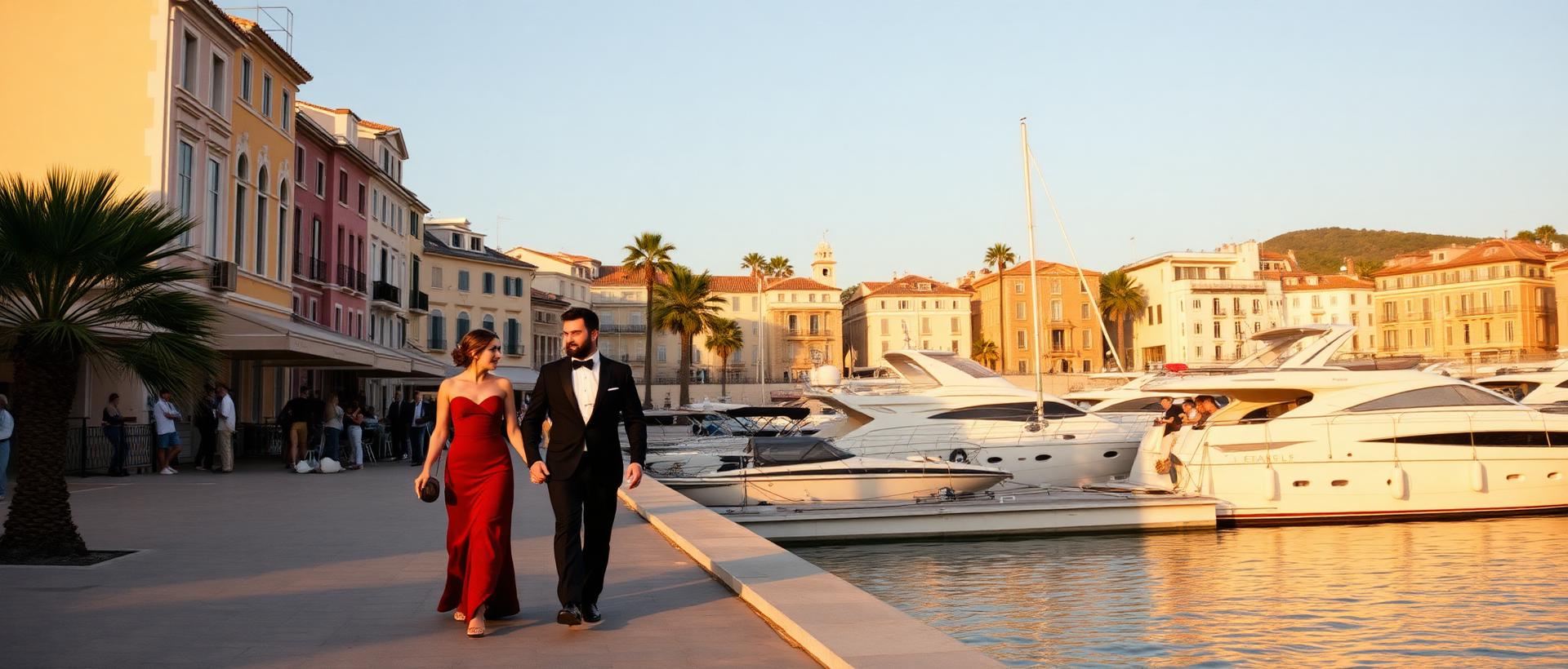An hour on Pampelonne at the late golden hour — the long stretch of pale sand, gentle Mediterranean waves, pine trees in the distance and a few elegant figures walking. The town's most quietly considered beach passage.